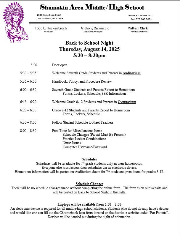 Shamokin Area School District is dedicated to providing quality education and diverse opportunities for its students, and striving to meet the needs of its community through academic programs, extracurricular activities, and support services.